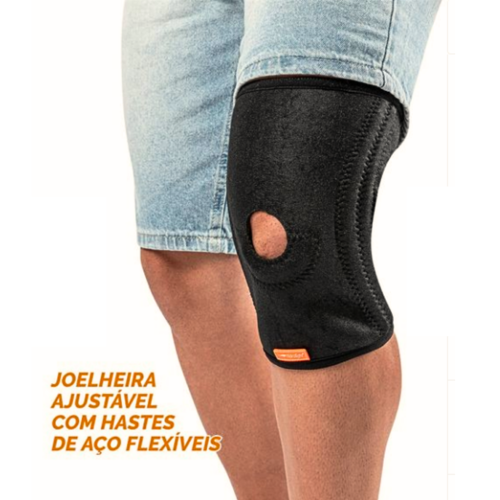 - Instruções de Uso Posicione a órtese em torno do joelho de forma que o orifício fique em torno da patela com o reforço posicionado na parte inferior. Ajuste conforme compressão adequada ao seu conforto. Composição Borracha de cloropreno revestida com tecido 100% poliamida.