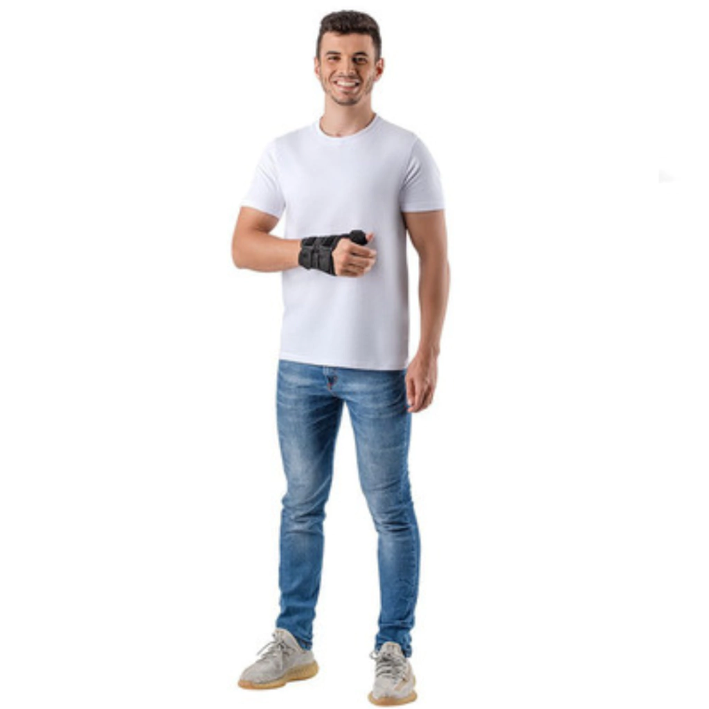 Instruções de Uso: Solte as tiras aderentes de ajuste e vista o produto na mão com o auxílio do suporte interno e o polegar posicionado no orifício superior. Os demais dedos devem ficar livres. Ajuste as tiras aderentes no dorso da mão e por fim aplique a compressão desejada e necessária no fecho com tira aderente do polegar.